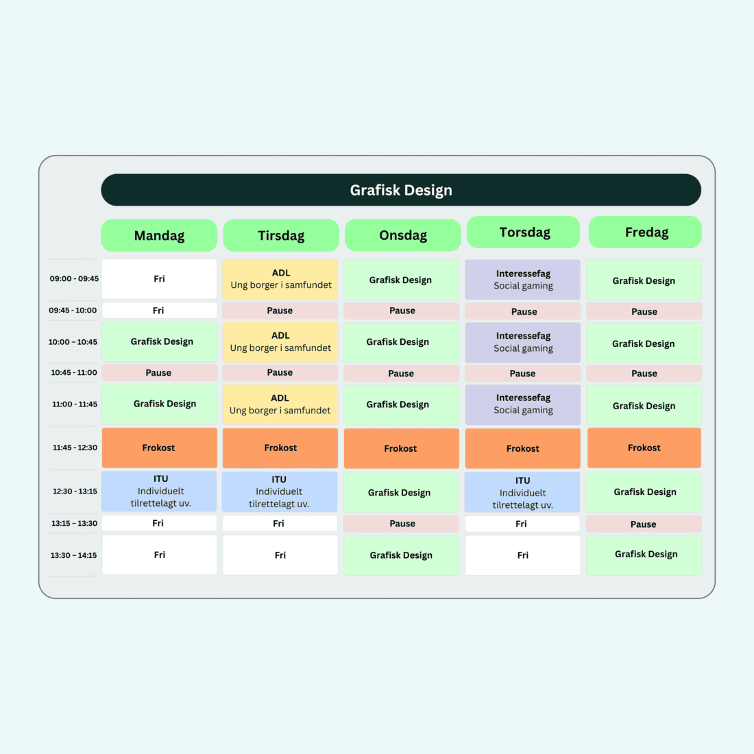 Som elev på Grafisk Design starter din dag mellem kl. 09:00 og 10:00. Du har mulighed for at begynde stille og roligt sammen med de andre elever.